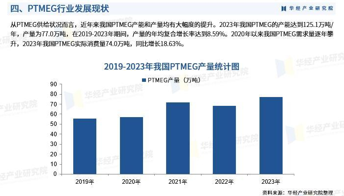 从PTMEG供给状况而言,近年来我国PTMEG产能和产量均有大幅度的提升。2023年我国PTMEG的产能达到125.1万吨/年,产量为77.0万吨,在2019-2023年期间,产量的年均复合增长率达到8.59%。2020年以来我国PTMEG需求量逐年攀升,2023年我国PTMEG实际消费量74.0万吨,同比增长18.63%。