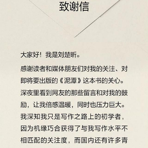 刘楚昕表示:“感谢读者和媒体朋友们对我的关注、对即将要出版的《泥潭》这本书的关心。深夜里看到网友的那些留言和对我的鼓励,让我倍感温暖,同时也压力巨大。我深知我只是写作之路上的初学者因为机缘巧合获得了与我写作水平不相匹配的关注度,而国内还有许多青年作家,他们比我更优秀、更刻苦,默默坚守在文学的沃土上。他们才是中国文学最热忱的守护者,应该获得社会的更多关注。”