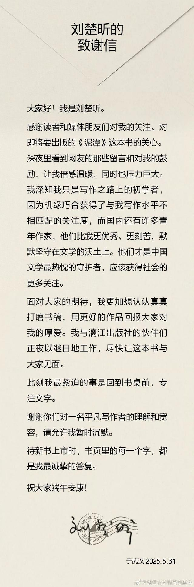刘楚昕发致谢信:倍感温暖也压力巨大,想认真打磨书稿,请允许我暂时沉默,祝大家端午安康