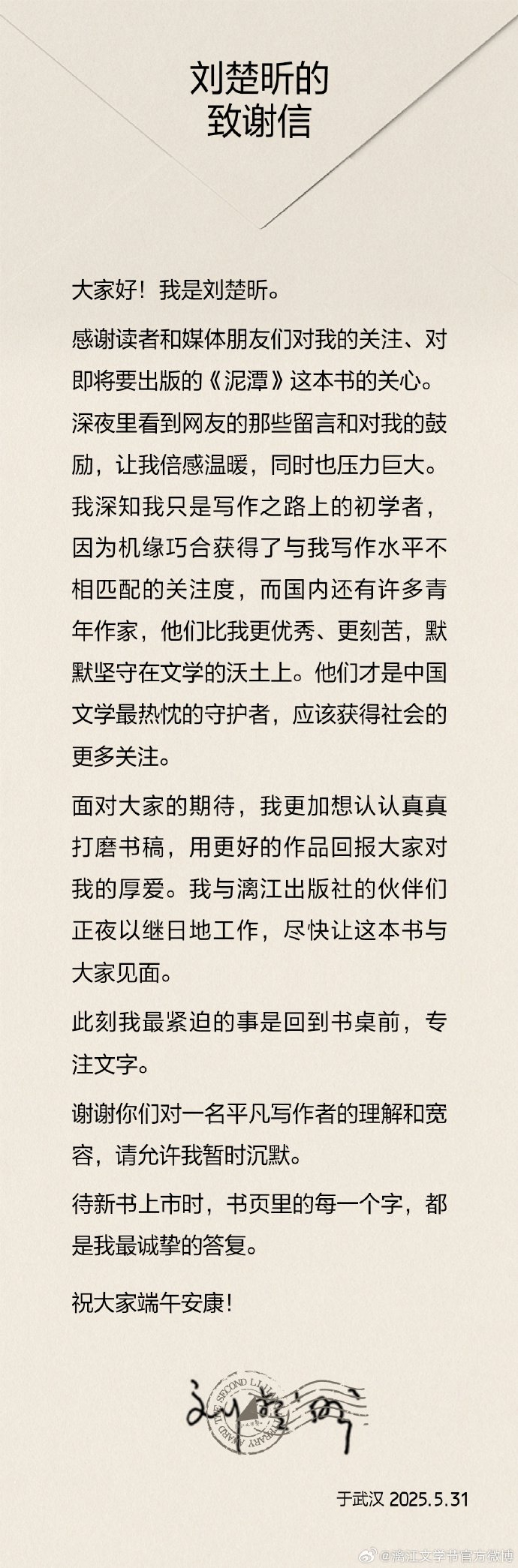 据漓江文学节官方微博消息,5月31日,作家刘楚昕发布致谢信:感谢读者和媒体朋友们对我的关注、对即将要出版的《泥潭》这本书的关心。深夜里看到网友的那些留言和对我的鼓励,让我倍感温暖,同时也压力巨大。面对大家的期待,我更加想认认真真打磨书稿,用更好的作品回报大家对我的厚爱。我与漓江出版社的伙伴们正夜以继日地工作,尽快让这本书与大家见面。
