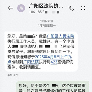 2025年4月,事件进一步恶化。4月7日,广阳区人民法院执行局赵姓工作人员短信通知颜女士参与调解,颜女士第一时间回复信息并电话联系,证明自己并非该案被执行人,工作人核实信息并确认,表示以后不会再打扰。到了23日,两名执行局工作人员携带民事判决书至颜女士工作单位,通过办公室人事科联系其领导核查身份,领导明确告知被执行人非颜女士本人。