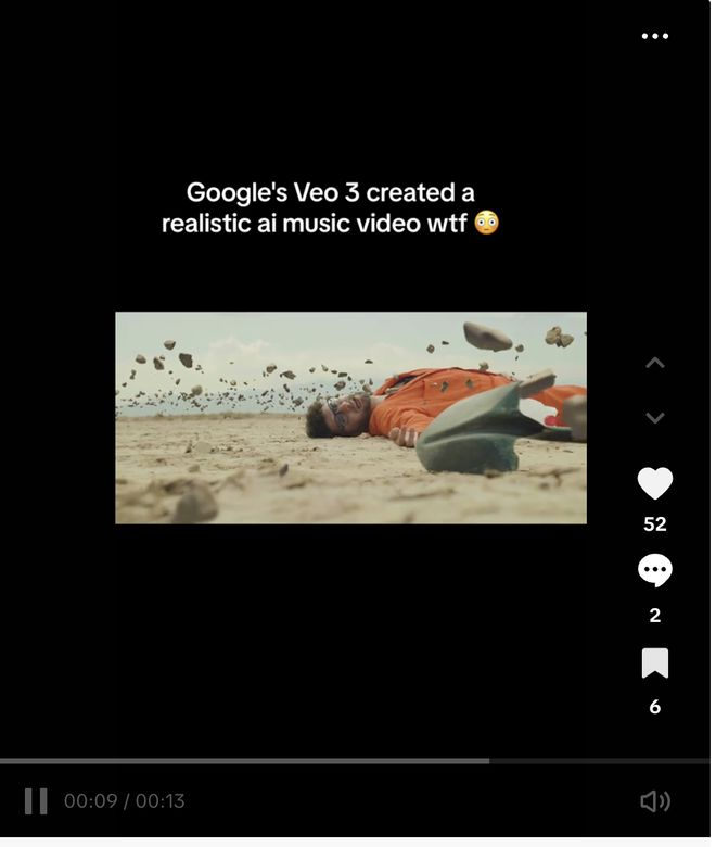音乐人 Darden Bela 在一支两年前的 MV 上加注 Veo 标签,声称为“逼真的 AI 音乐视频”;说唱歌手 GameBoi Pat 则将一首旧作配以“Google Veo 3 创造了一位听起来很真实的说唱歌手”的文案,诱导观众误以为其内容为 AI 产出。这类以“AI 创作”之名吸引点击的做法正不断蔓延。