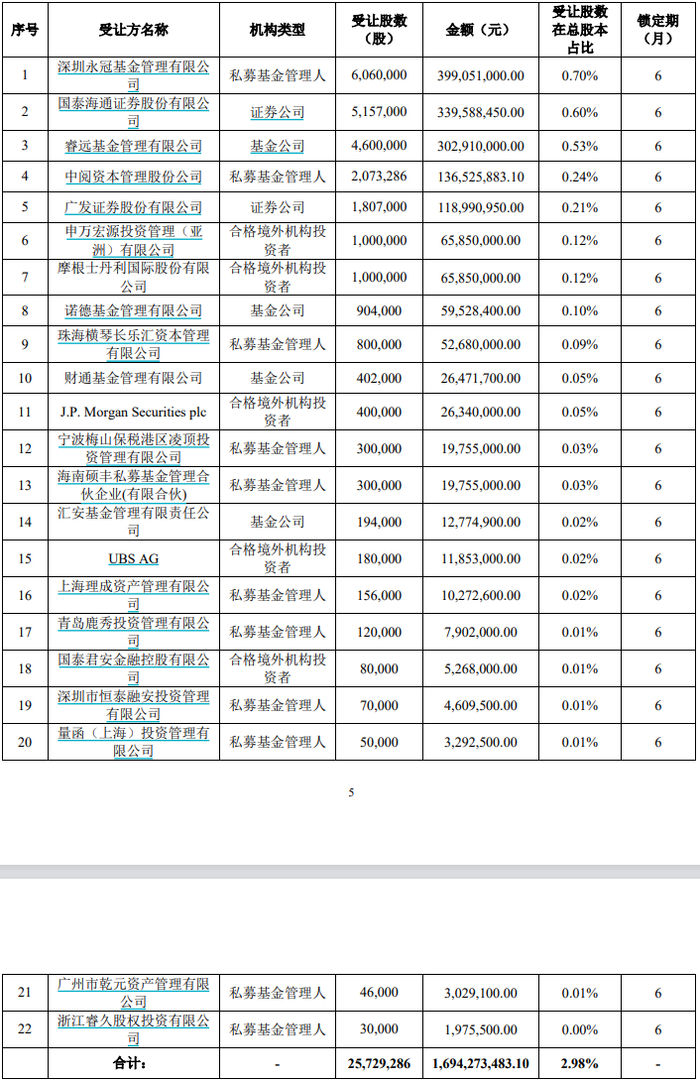 受让方为22名机构投资者,近3%的股份被合格境外投资者、基金管理公司、私募基金管理人、证券公司四方机构“分而食之”。这些机构多为各领域的知名机构。