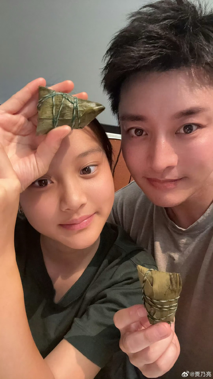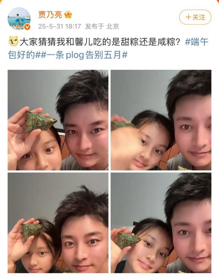 5月31日端午节,贾乃亮在微博晒出与女儿甜馨的合照,并配文询问粉丝两人吃的是甜粽还是咸粽。照片中,父女身穿同款军绿色T恤,甜馨手举粽子对镜头露出梨涡笑容,贾乃亮则眉眼含笑,两人五官轮廓高度相似。这一互动引发网友热议,多个账号转发评论称“父女如复制粘贴”,并回忆甜馨童年综艺中“我们白着呢”等经典语录。