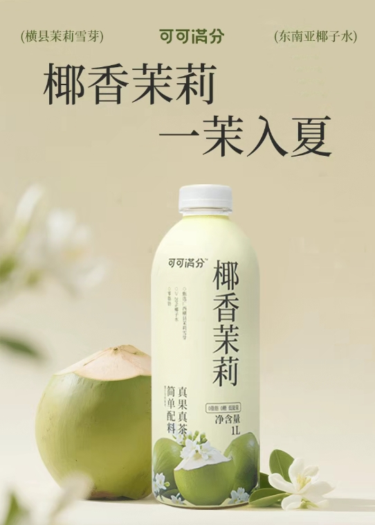 5月26日,可可满分推出椰香茉莉新品。该产品精选横县茉莉雪芽与东南亚椰子水为原料,坚持真果真茶的配方理念,其中椰子水添加量不低于20%。口感上,产品前调为清甜椰香,中调带来茉莉绿茶的鲜爽口感,后调为罗汉果回甘。目前,该新品已同步在沃尔玛渠道上架销售。