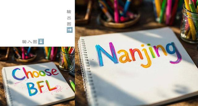 文本编辑:上传一张含有手写字的照片,输入 “将文字改为Nanjing”,模型不仅准确修改文字内容,还自动调整排版与背景光影,使新标题与画面融为一体。