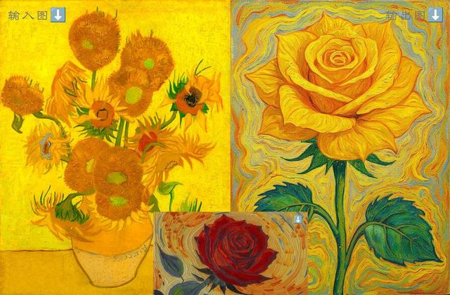 风格迁移:提供一张梵高的向日葵画作作为参考,输入 “用相同笔触绘制一幅玫瑰画作”,生成的图像既保留印象派的色彩层次,又精准还原玫瑰花的细节。