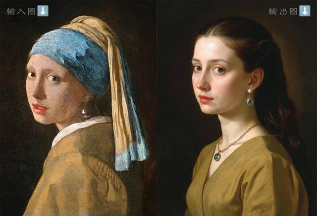 图片编辑:尝试 “将戴珍珠耳环的少女改成一个长发戴着宝石耳环和项链”的创意,模型同时处理少女的发型、项链、耳环等元素,最终输出的图像细节丰富。