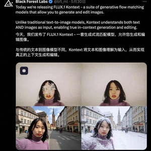 近日,国外AI团队黑森林实验室(Black Forest Labs)宣布推出新一代 AI 图像生成与编辑模型FLUX.1 Kontext,这是继去年 8 月首次发布Flux模型后,该团队在多模态生成领域的又一里程碑。据官方介绍,与传统文本到图像模型不同,FLUX.1 Kontext 首次实现了文本与图像双输入的上下文生成与编辑,允许用户通过自然语言指令直接修改现有图像的局部或全局元素,同时保持角色一致性和视觉连贯性。