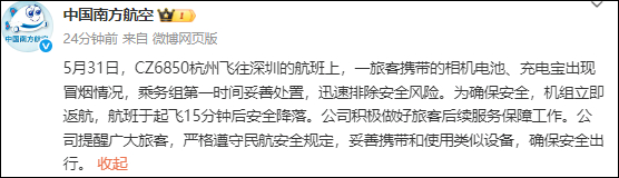 5月31日,CZ6850杭州飞往深圳的航班上,一旅客携带的相机电池、充电宝出现冒烟情况,乘务组第一时间妥善处置,迅速排除安全风险。为确保安全,机组立即返航,航班于起飞15分钟后安全降落。公司积极做好旅客后续服务保障工作。公司提醒广大旅客,严格遵守民航安全规定,妥善携带和使用类似设备,确保安全出行。