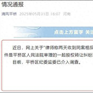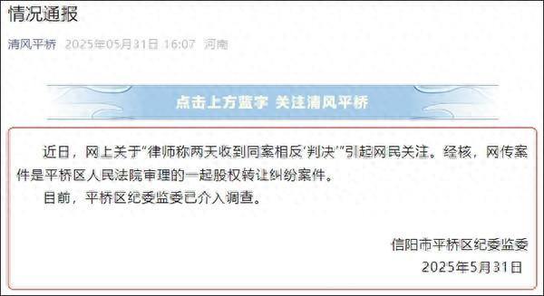 5月31日,河南信阳平桥区纪委监委微信公众号“清风平桥”发布情况通报称,近日,网上关于“律师称两天收到同案相反‘判决’”引起网民关注。经核,网传案件是平桥区人民法院审理的一起股权转让纠纷案件。