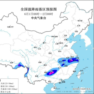 6月1日至6月2日,青藏高原东部及中东部地区有较大范围降水,江汉、江淮西部、江南、华南北部及西藏东南部、贵州、云南等地有中到大雨,其中,湖北东部、湖南北部和西南部、安徽南部、江西北部、浙江中西部、贵州东南部、广西北部及西藏东南部、云南西北部等地部分地区有暴雨、局地大暴雨;并伴有局地短时强降水、雷暴大风等强对流天气。中央气象台6月1日06时继续发布暴雨黄色预警,预计,6月1日08时至2日08时,湖北东部、安徽南部、江西北部、江苏南部、上海、浙江中北部、湖南东北部和西南部、贵州东南部、广西北部以及云南西北部、西藏东南部等地部分地区有大到暴雨,其中,安徽南部、浙江西北部、湖南西南部、贵州东南部、广西北部、云南西北部、西藏东南部等地部分地区有大暴雨(100~130毫米)。上述部分地区伴有短时强降水(最大小时降雨量20~40毫米,局地可超过50毫米),局地有雷暴大风等强对流天气(见图1)。