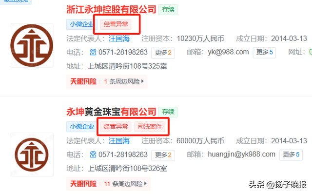 5月23日,永坤黄金和浙江永坤控股有限公司已被列入经营异常名录,原因为“通过登记的住所或者经营场所无法联系”。