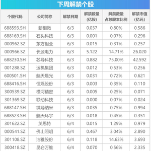 从解禁市值来看,6月6日是解禁高峰期,9家公司解禁市值合计152.82亿元,占下周解禁规模的57.31%。按5月30日收盘价计算,解禁市值居前三位的是:芯导科技(42.59亿元)、华强科技(40.81亿元)、*ST铖昌(35.54亿元)。