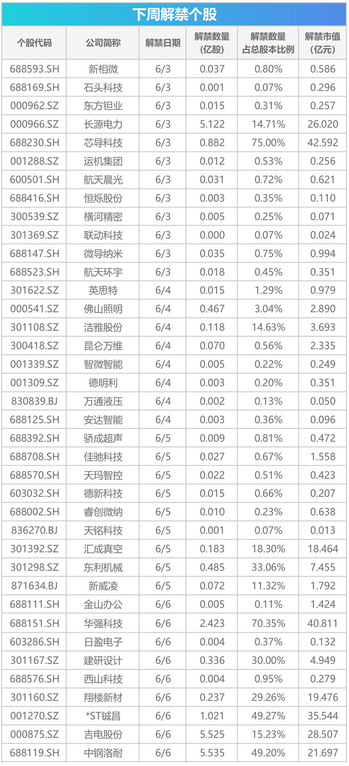下周(6月2日-6月6日)共有38家公司限售股陆续解禁,合计解禁22.76亿股,按5月30日收盘价计算,解禁总市值为266.66亿元。