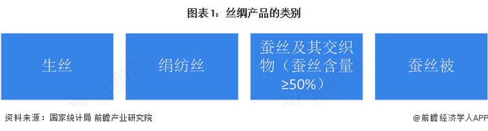 广义的丝绸涵盖整体产业链中的“桑、蚕、茧、丝、绸、成品”。现代所述丝绸一般指以蚕茧为原料,经过缫丝、织造、染整、印花等一系列(或部分)步骤制成的纺织品的总称。根据国家统计局分类标准,主要丝绸产品为生丝、绢纺丝、蚕丝及其交织物(蚕丝含量≥50%)和蚕丝被4种。