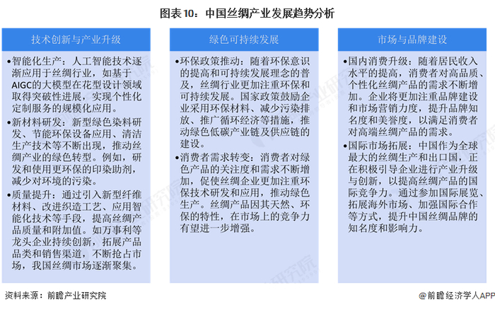 中国丝绸行业正呈现出以下三点发展趋势:首先,技术创新与产业升级成为行业发展的重要推动力。人工智能技术在花型设计等领域的应用日益普及,智能化生产和新材料研发不断突破,提升了丝绸产品的质量和附加值。其次,绿色可持续发展成为行业的关键方向。环保政策的推动和消费者对绿色产品需求的增加,促使企业更加注重环保技术的应用和绿色生产,推动了绿色低碳产业链及供应链的建设。最后,市场与品牌建设不断深化。随着国内消费升级和国际市场拓展,企业更加注重品牌建设和市场营销,积极拓展线上渠道,提升品牌知名度和国际竞争力。