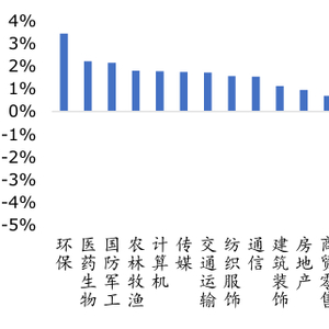 行业方面,上周A股市场申万31个一级行业有18个行业收涨。涨幅靠前的行业包括环保行业、医药生物、国防军工等。跌幅较为显著的行业有汽车、电力设备、有色金属等行业。周度来看A股市场行业轮动的速度较快。