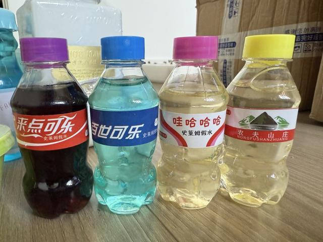 比如,“珍珠奶茶”的“假水”会做成巧克力色,并添加类似珍珠的小圆颗粒;“幻彩琉璃”则会做成色泽光亮的粉色并添加闪粉。更有甚者,会将“假水”做成小瓶的饮料包装,类似酸奶、可乐、雪碧等包装,细看才会发现有“史莱姆禁止食用”的标识。