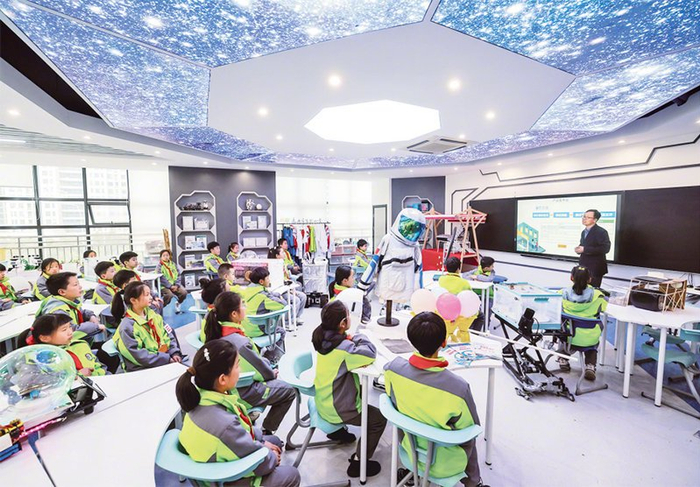 办好义务教育事关每个家庭切身利益,关系国家和民族未来。近年来,各地积极探索义务教育优质均衡发展的实现路径和有效举措。图为2025年3月12日,在浙江省嘉兴市实验小学科技城校区内,老师在指导学生完成“AI赋能生活”项目化学习。 新华社记者 徐昱/摄