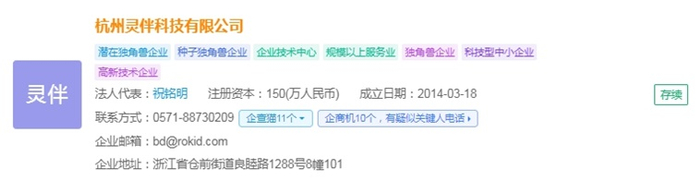 企查猫资料显示,灵伴科技(Rokid)全称杭州灵伴科技有限公司,成立于2014年,法人代表是祝铭明,注册资金为150(万人民币),是一家专注于人机交互与增强现实(AR)技术的全球领先企业,国家高新技术企业,杭州市“独角兽”企业。公司深耕5G+AI+AR领域的软硬件产品开发,通过语音识别、自然语言处理、计算机视觉、光学显示、芯片平台、硬件设计等多领域研究,将前沿的AI和AR技术与行业应用相结合,为不同垂直领域的客户提供全栈式解决方案。