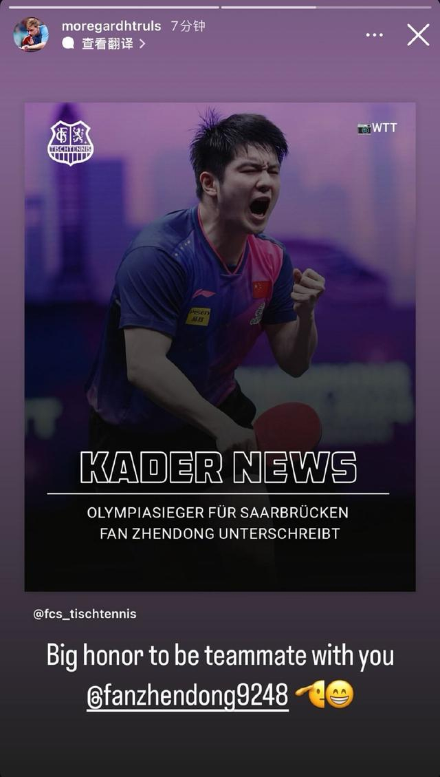 球队现有阵容星光熠熠,包括巴黎奥运会男单亚军莫雷高德、巴黎奥运会男团亚军德国男乒主力弗朗西斯卡等人,和老对手樊振东搭档参赛,队友们第一时间在社交平台上表示:“很荣幸能和你成为队友。”
