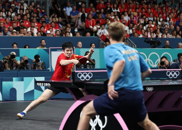 新华社照片,巴黎,2024年8月4日 8月4日,樊振东(左)在比赛中。 当日,在巴黎奥运会乒乓球男单决赛中,中国选手樊振东4比1战胜瑞典选手莫雷高德,夺得金牌。 新华社记者 王东震 摄