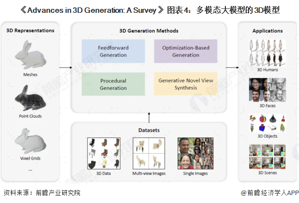 3D生成模型:前馈生成(通过前向传递中直接生成结果)、基于优化的生成(每次生成需要迭代优化)、程序生成(根据规则创建3D模型)、生成式新视图合成(生成多视角图像);