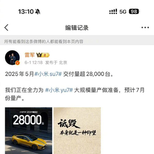 然而,随后,雷军编辑了本条微博,删除了这句话,仅留下了相关图片和小米汽车相关信息。