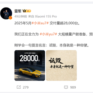 6月1日,小米集团董事长雷军在其社交账号 @雷军 发文:我们正在全力为 小米yu7 大规模量产做准备,预计7月份量产。刚学会一句莫言名言:诋毁,本身就是一种仰望。