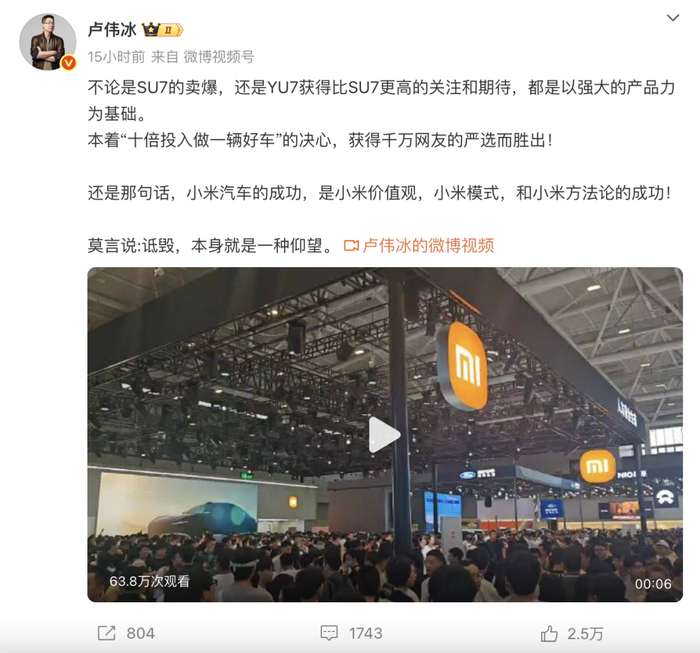 稍后在5月31日晚间,小米集团总裁 @卢伟冰 发文: