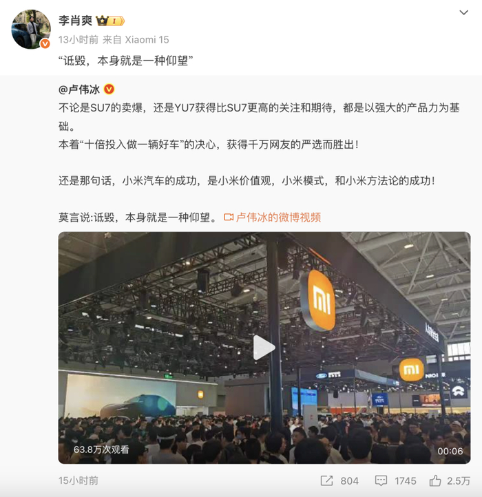 小米汽车副总裁李肖爽随后转发该文并表示:“诋毁,本身就是一种仰望”。