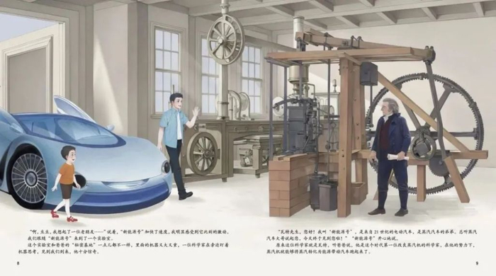 书中以汽车工程师爸爸带儿子“豆豆”参观“神秘实验室”为开端,随后驾驶“新能源号”电动汽车穿越时空隧道,开启汽车百余年历史游历之旅。通过与杰出汽车先驱对话、参与汽车实验、解决研发问题等场景化呈现,孩子们能清晰感知在科技革命与环保力量推动下,世界汽车工业文明的发展脉络与关键节点,从中学习到丰富的汽车相关知识。