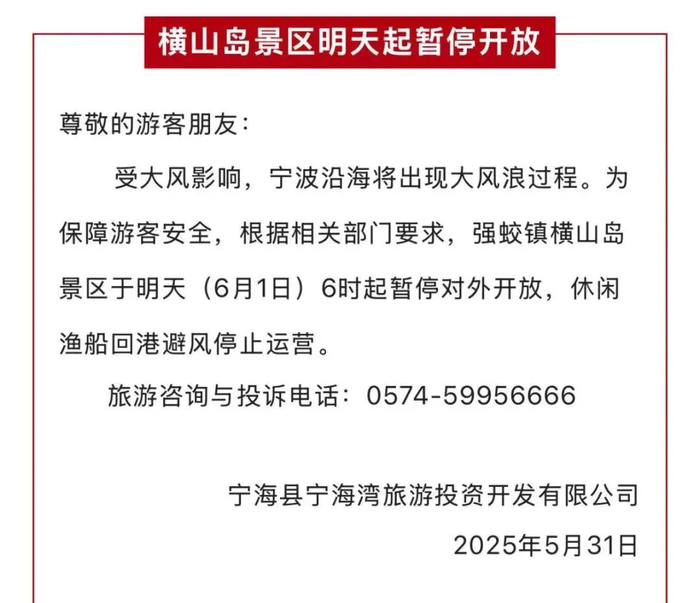 受大风影响,宁波沿海将出现大风浪过程。为保障游客安全,根据相关部门要求,强蛟镇横山岛景区于6月1日6时起暂停对外开放,休闲渔船回港避风停止运营。