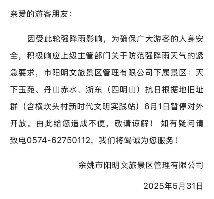 余姚市阳明文旅景区管理有限公司下属景区天下玉苑、丹山赤水、浙东(四明山)抗日根据地旧址群(含横坎头村新时代文明实践站)6月1日暂停对外开放。