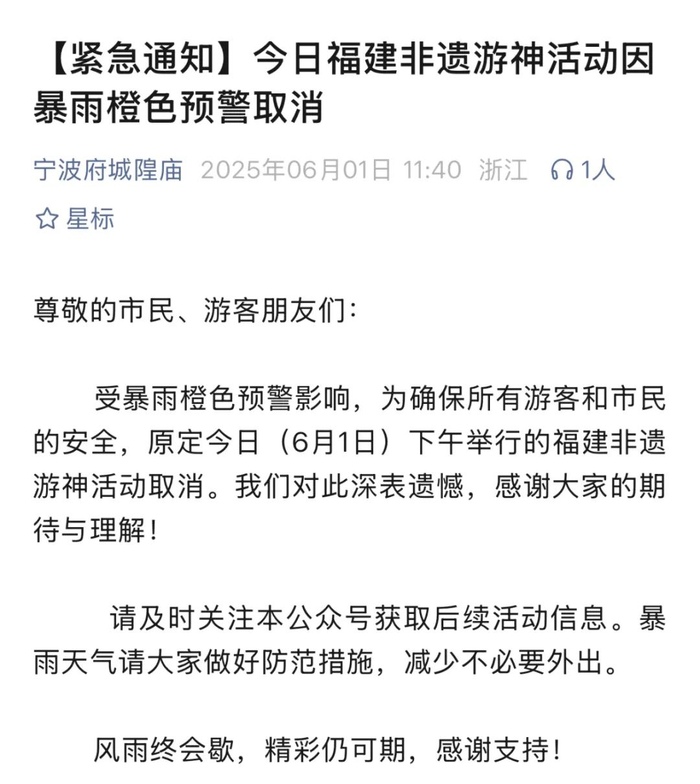 宁波城隍庙发出了关于“今日福建非遗游神活动因暴雨橙色预警取消”的紧急通知。