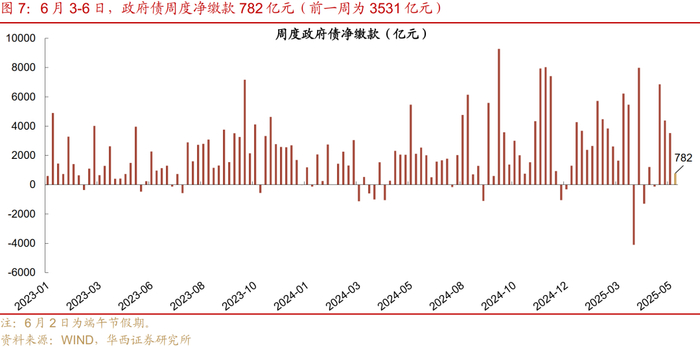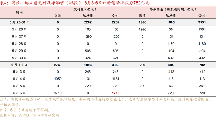 政府债缴款压力大幅降低,净缴款规模为782亿元。按发行日计算,6月3-6日,政府债计划发行量为3856亿元,较上周2282亿元有所回升。其中,国债计划发行2760亿元,地方债计划发行1096亿元。