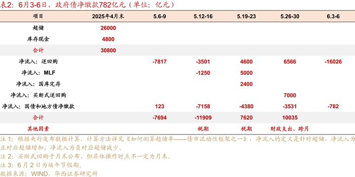 往后看,月初首周(6月3-6日)资金面利好因素偏多,隔夜利率或将进一步回落至1.4%-1.5%水平。一方面,5月末财政支出,或对6月初的流动性形成支撑。参考2021-24年,5月末财政支出规模分布在1.7-1.9万亿元。在此背景下,月初资金利率通常下行,2021-24年跨月前后一周,R001周均值下行幅度分布在1-9bp区间;R007同样走低,各年份降幅均超10bp。另一方面,跨月后,政府债净缴款规模降至千亿元以下,为782亿元(节前一周为3531亿元),对资金面的扰动相对有限。