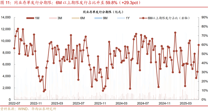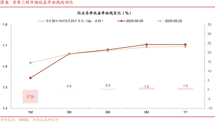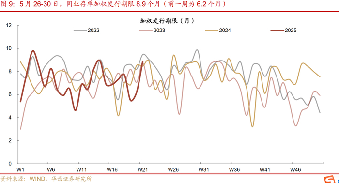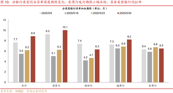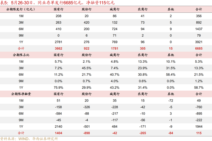 存单发行期限持续拉伸。5月26-30日,同业存单加权发行期限进一步拉伸至8.9个月,前一周为6.2个月。分期限结构观察,银行主要发行期限为1年(占58.7%),其次是6个月(占21.5%)。分机构观察,仅农商行发行期限小幅压缩0.2个月至6.5个月,其余类型银行均拉伸,其中,国有行和股份行发行期限拉伸幅度较大,分别拉伸3.8、1.6个月至10.1、6.3个月,6M以上期限发行占比分别环比升44.9、11.9pct至76.0%、30.6%。