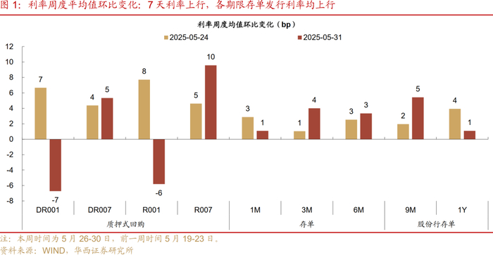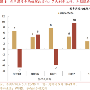 全周来看,隔夜和7天资金利率分化,其中隔夜利率较前一周回落,DR001、R001周均值较上周分别下行7、6bp。而与历史同期相比,以R001为例,2021年以来同期隔夜利率均在上行,幅度介于4-14bp之间。7天资金利率小幅上行,DR007、R007分别环比上行5、10bp,上行幅度也小于历史同期。以R007为参考,本轮上行幅度处于近四年同期的低点,2021-24年5月最后一周R007上行幅度多在15bp以上。可见,央行对当前资金面偏呵护的态度。