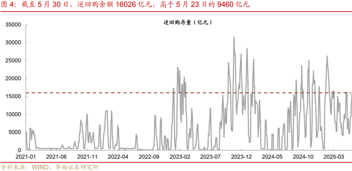 5月26-30日,央行公开市场净投放6566亿元,其中逆回购投放16026亿元,到期9460亿元。截至5月30日,逆回购余额16026亿元,较5月23日的9460亿元大幅提升。