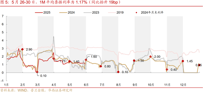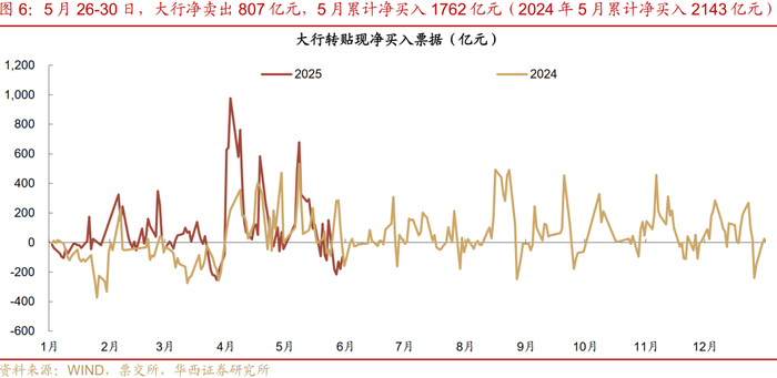 5月末周(5月26-30日),票据利率同比升高,大行持续卖票。截至5月30日,1M、6M转贴现票据利率分别较前一周下行8bp、3bp至1.10%和1.06%,3M票据利率则上行7bp至1.16%,不过与去年相比,1M票据利率周均值同比高19bp。在此期间,大行净卖出807亿元,5月累计净买入1762亿元(2024年5月累计净买入2143亿元)。