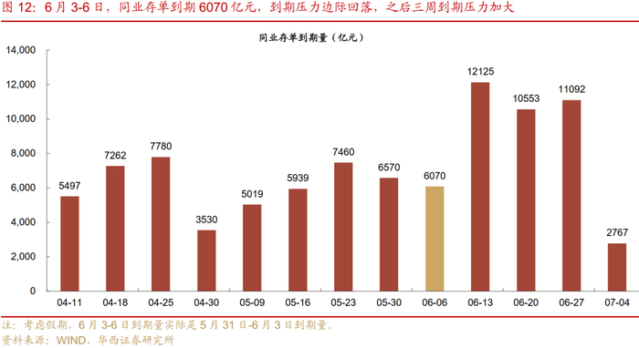 往后看,存单到期压力有所回落。下周(6月3-6日)存单到期6070亿元,规模略低于前一周的6570亿元,不过后续一周存单到期压力将显著提升,到期规模超过1.2万亿元。整体来看,5月同业存单到期规模接近2.5万亿元,与4月基本持平,而6月存单到期量将大幅提升至4.2万亿元,为历史单月到期最大规模。银行需要发行大量存单进行对冲,6月存单供给压力抬升。