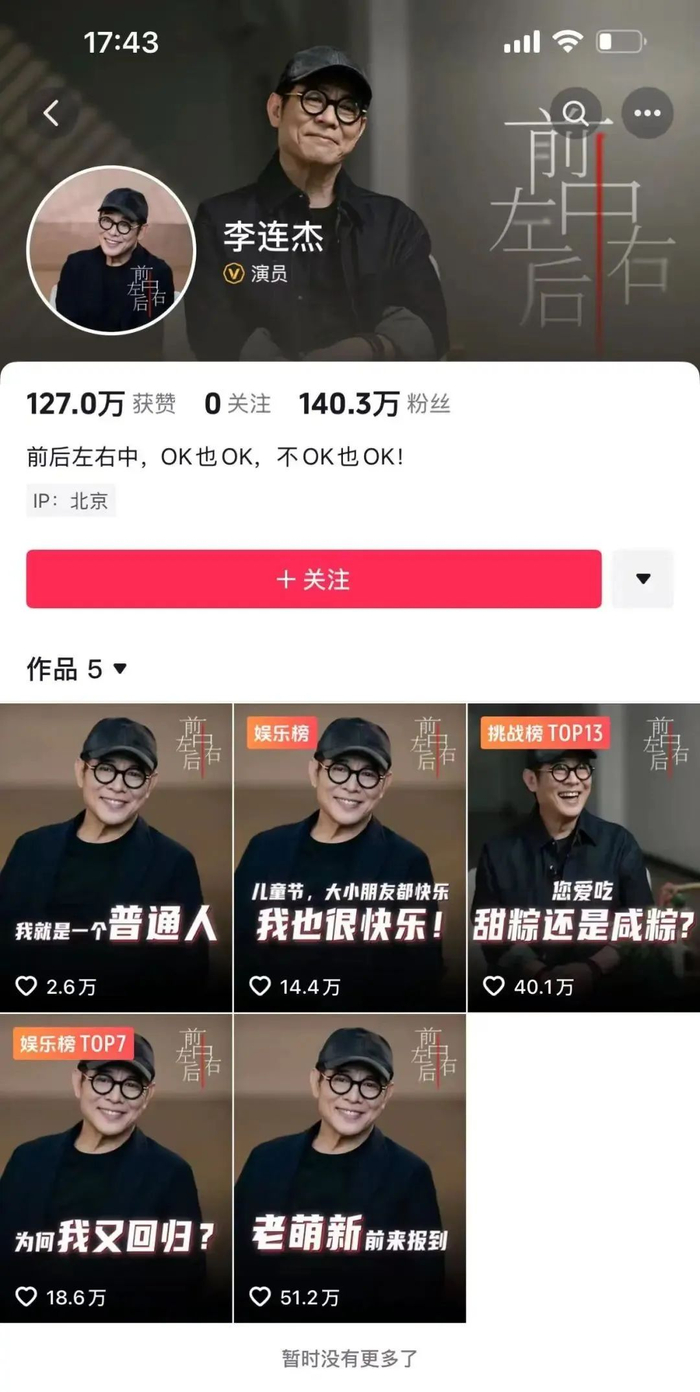 6月1日,截至17时许,李连杰抖音账号已拥有超140万粉丝,发布了5条视频。