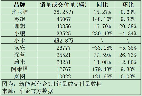 【导读】新能源车企5月“成绩单”出炉:零跑领跑,小米徘徊不前