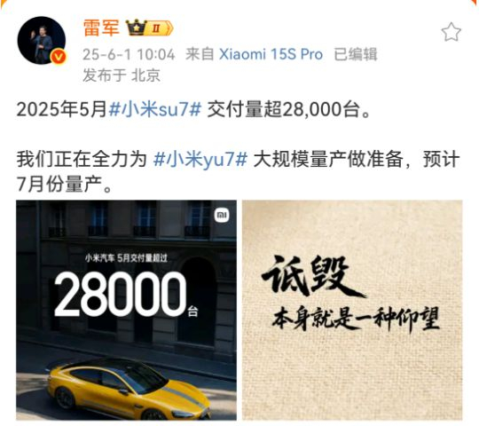 6月1日,小米创办人、董事长兼CEO雷军发布微博称:“我们正在全力为小米YU7的大规模量产做准备,预计7月份量产。”