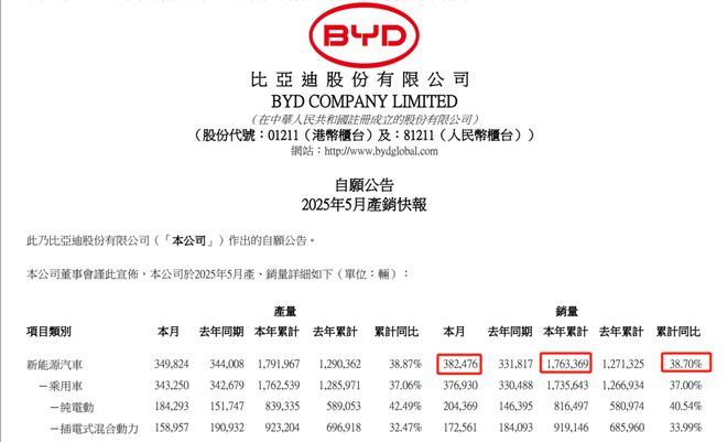 6月1日晚间,比亚迪在港股公告称,公司5月销量为38.25万辆,同比增长15.27%。1月至5月,公司累计销量达176.34万辆,同比增长38.70%。
