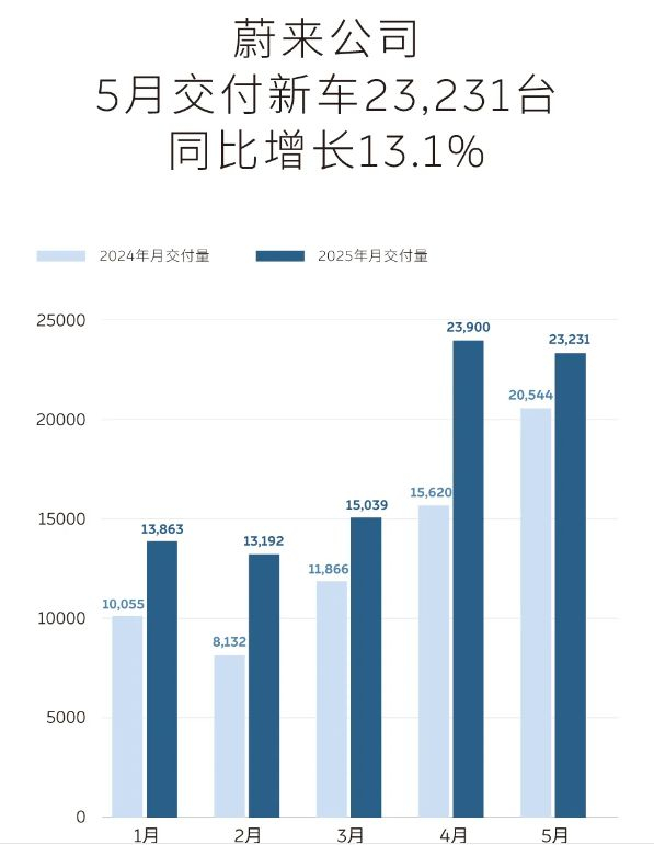 以蔚来为例,其5月交付量为2.23万辆,同比增长13.08%。接近车企人士向记者介绍,蔚来的几款车型在5月下旬或5月底焕新上市,成效或将在6月呈现。