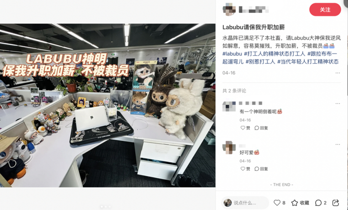 “也有人问我,三十多岁了还玩娃娃幼不幼稚,但在我眼中这个歪牙大笑的崽,是再用最夸张的表情对抗这个世界的规训。” 90后白领莉莉丝表示,她的工位上常年整齐摆放着精心打扮后的Labubu,在她看来Labubu的意义已经远超过萌系玩偶带来的治愈感,更是起到了激励自己勇敢对抗职场PUA的功效。