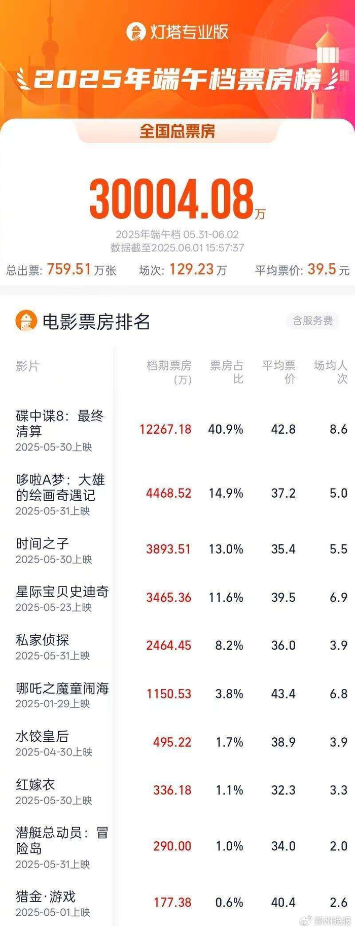据灯塔专业版,截至6月1日15时57分,2025年端午档(5月31日~6月2日)档期内票房(含预售)突破3亿,《碟中谍8:最终清算》领跑档期票房榜。